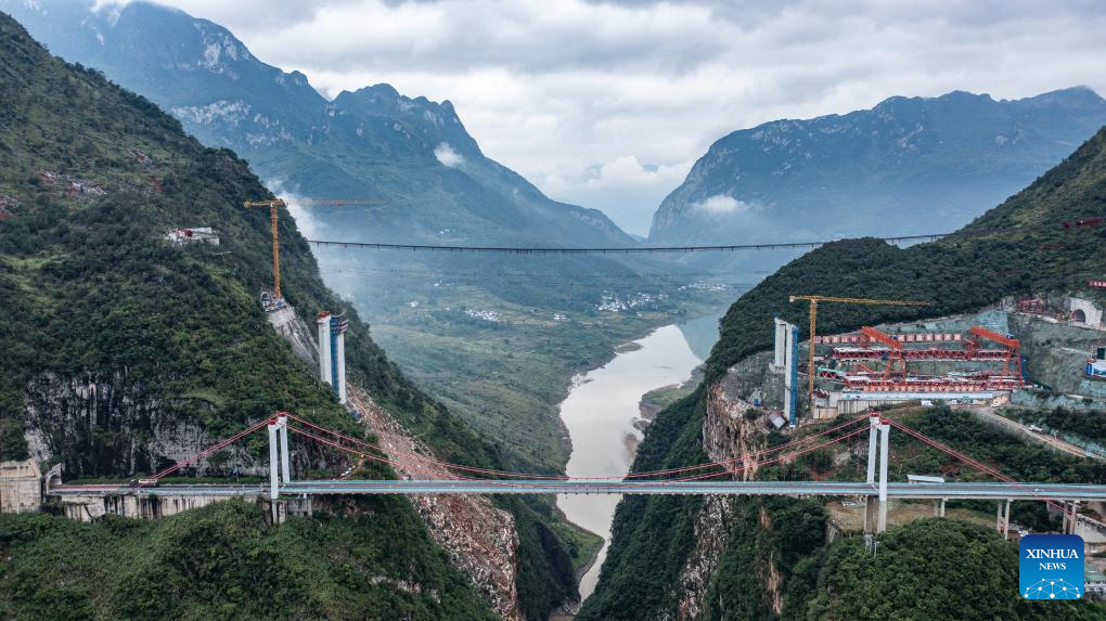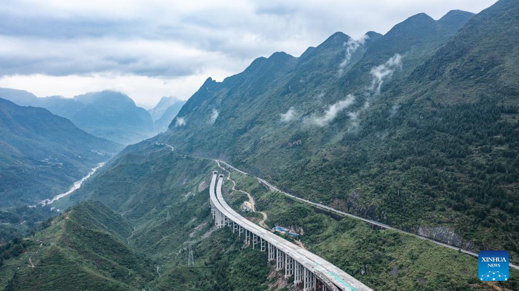 This aerial photo taken on Oct. 10, 2023 shows the construction site of Wumeng Mountain bridge (above) on Nayong-Qinglong Expressway in southwest China's Guizhou Province.
