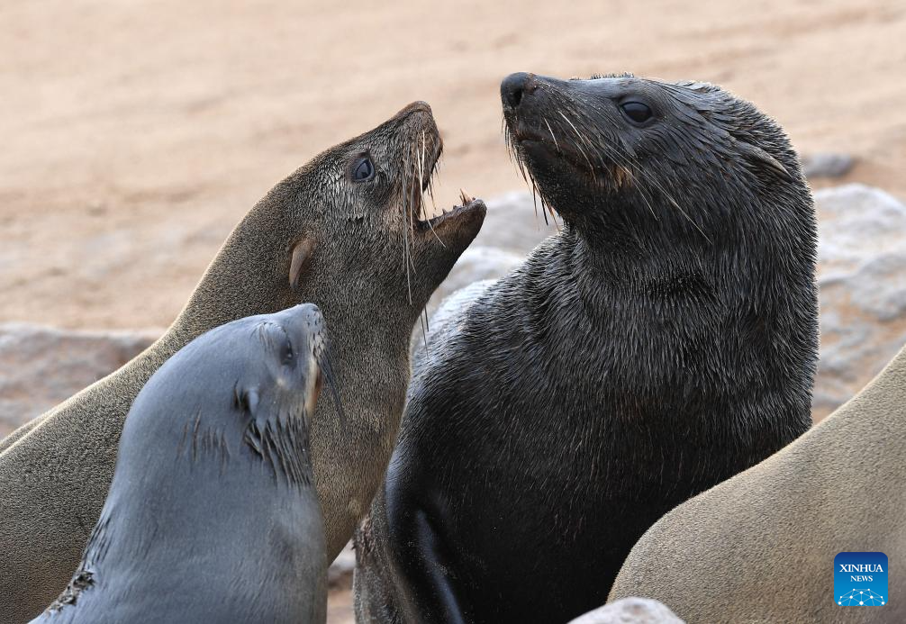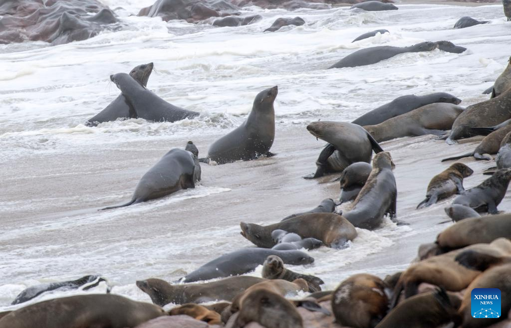 Cape fur seals are pictured in the Cape Cross Seal Reserve, Namibia, Oct. 11, 2023. Namibia's coastline is home to the Cape Cross Seal Reserve, which is one of the largest settlements of Cape fur seals in the world. (Xinhua/Chen Cheng)