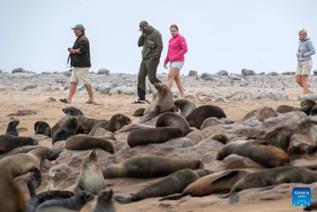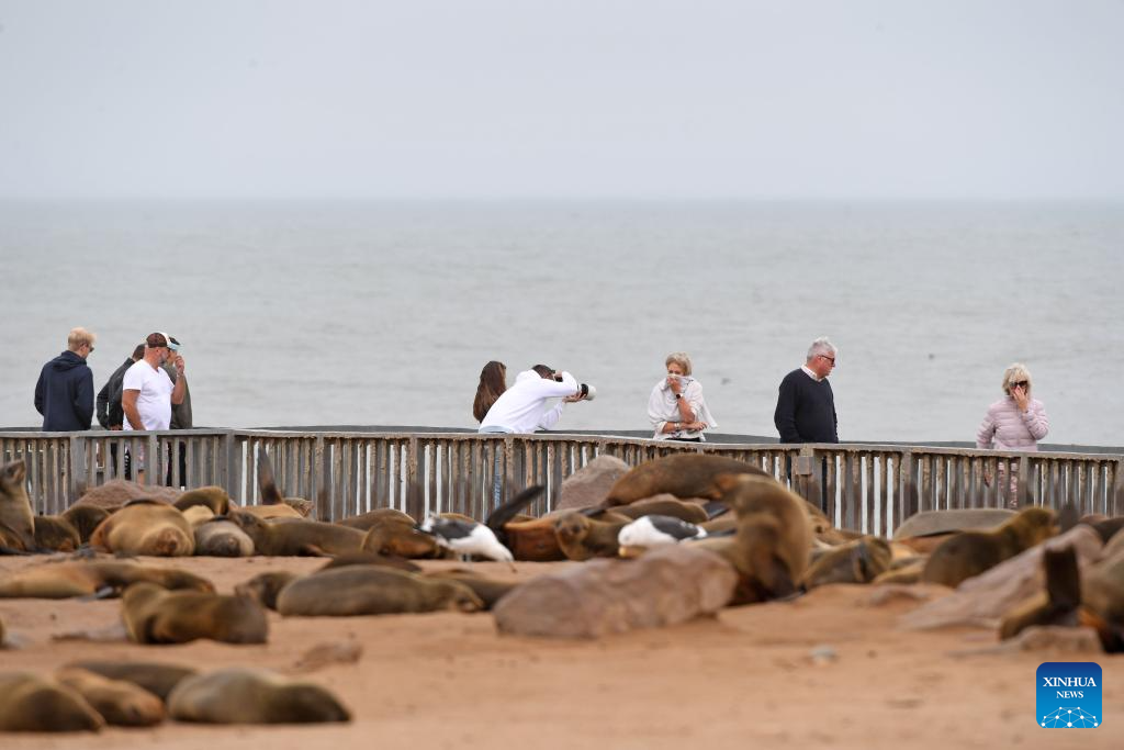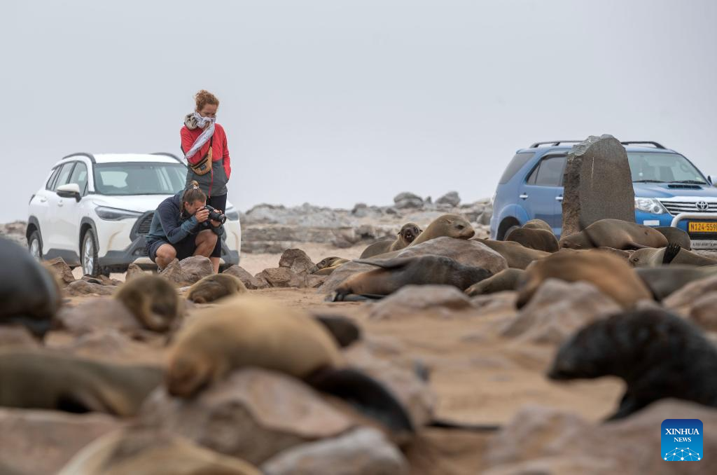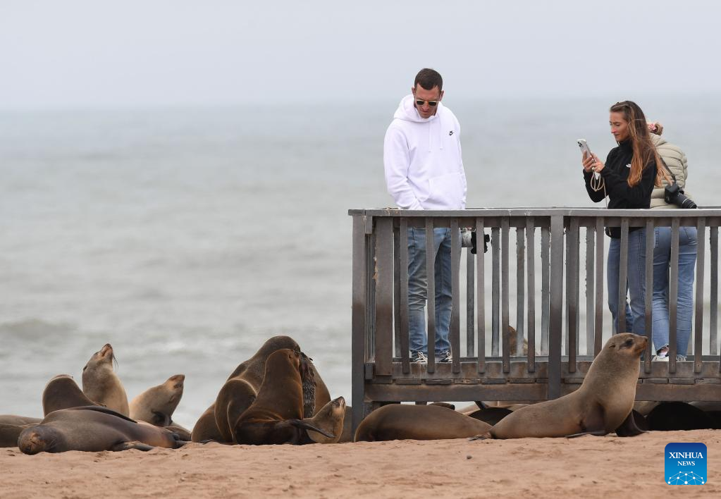 Tourists enjoy themselves in the Cape Cross Seal Reserve, Namibia, Oct. 11, 2023. Namibia's coastline is home to the Cape Cross Seal Reserve, which is one of the largest settlements of Cape fur seals in the world. (Xinhua/Chen Cheng)