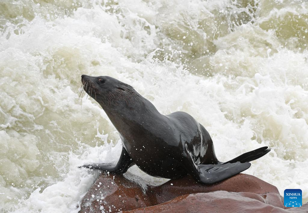 A Cape fur seal is pictured in the Cape Cross Seal Reserve, Namibia, Oct. 11, 2023. Namibia's coastline is home to the Cape Cross Seal Reserve, which is one of the largest settlements of Cape fur seals in the world. (Xinhua/Chen Cheng)