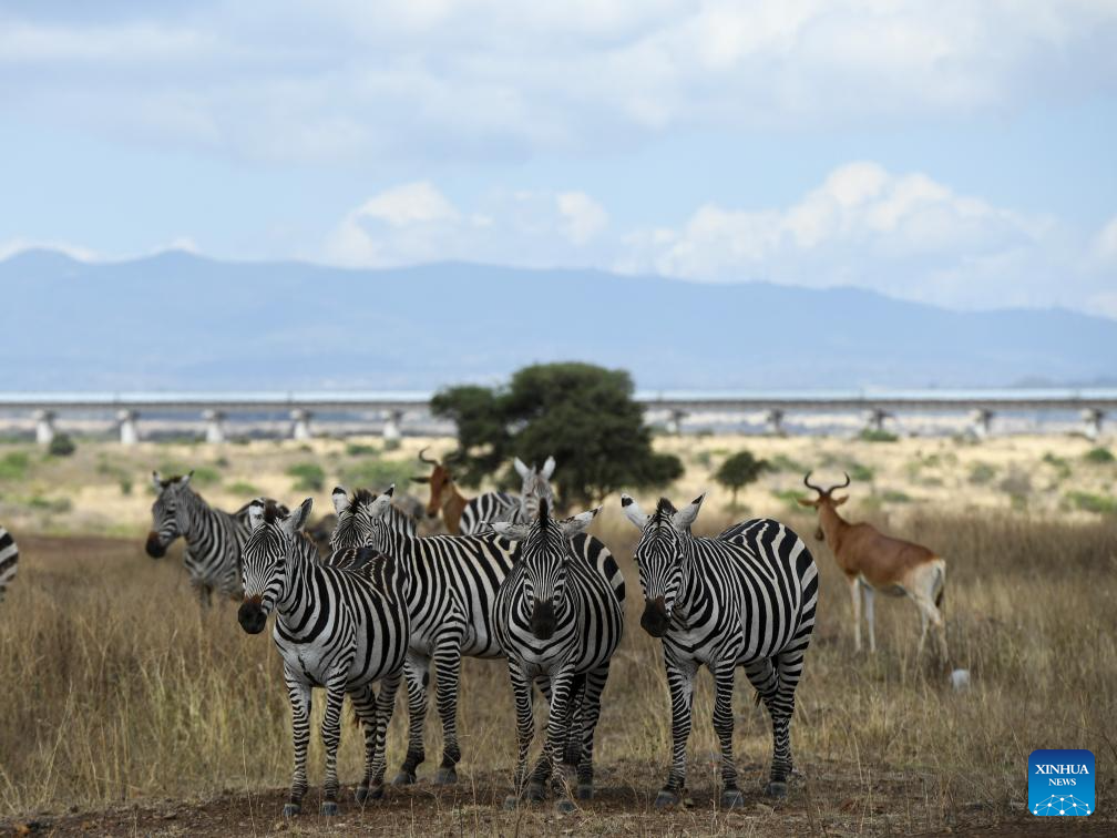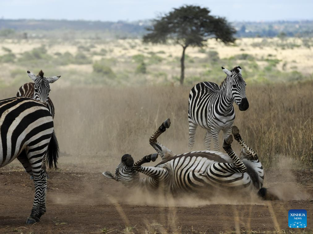 This photo taken on Oct. 15, 2023 shows zebras at Nairobi National Park in Nairobi, Kenya. The Nairobi National Park, situated approximately 7 kilometers from the city center, is a habitat for varied wildlife population. Established in 1946, this park is home to nearly 100 species of mammals and over 500 species of birds (Xinhua/Li Yahui)