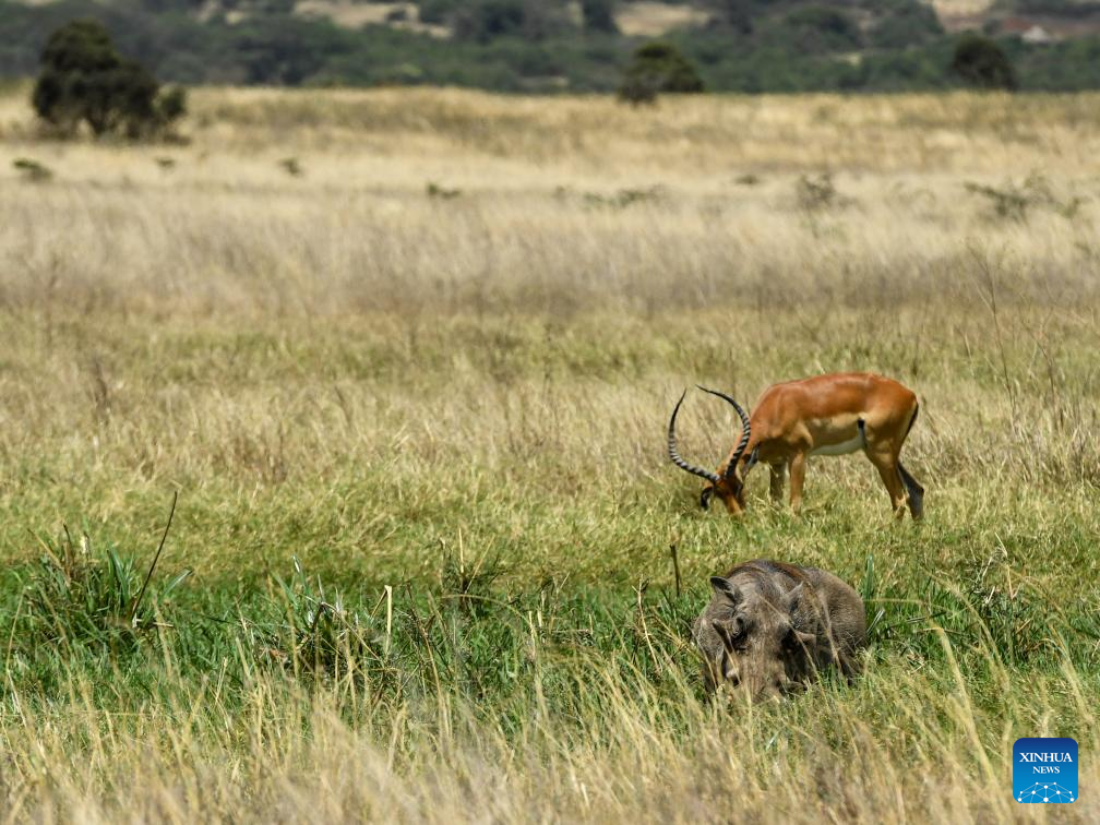 This photo taken on Oct. 15, 2023 shows a warthog and an impala at Nairobi National Park in Nairobi, Kenya. The Nairobi National Park, situated approximately 7 kilometers from the city center, is a habitat for varied wildlife population. Established in 1946, this park is home to nearly 100 species of mammals and over 500 species of birds (Xinhua/Li Yahui)