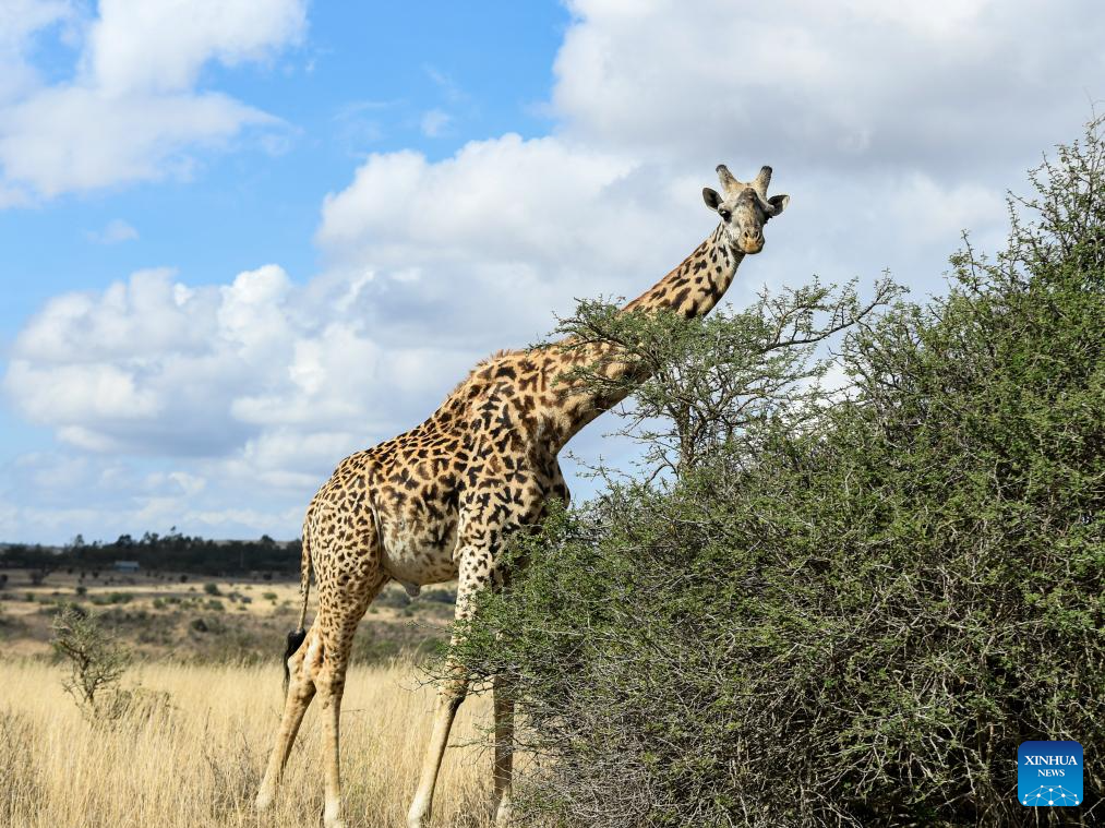 This photo taken on Oct. 15, 2023 shows a giraffe at Nairobi National Park in Nairobi, Kenya. The Nairobi National Park, situated approximately 7 kilometers from the city center, is a habitat for varied wildlife population. Established in 1946, this park is home to nearly 100 species of mammals and over 500 species of birds (Xinhua/Li Yahui)
