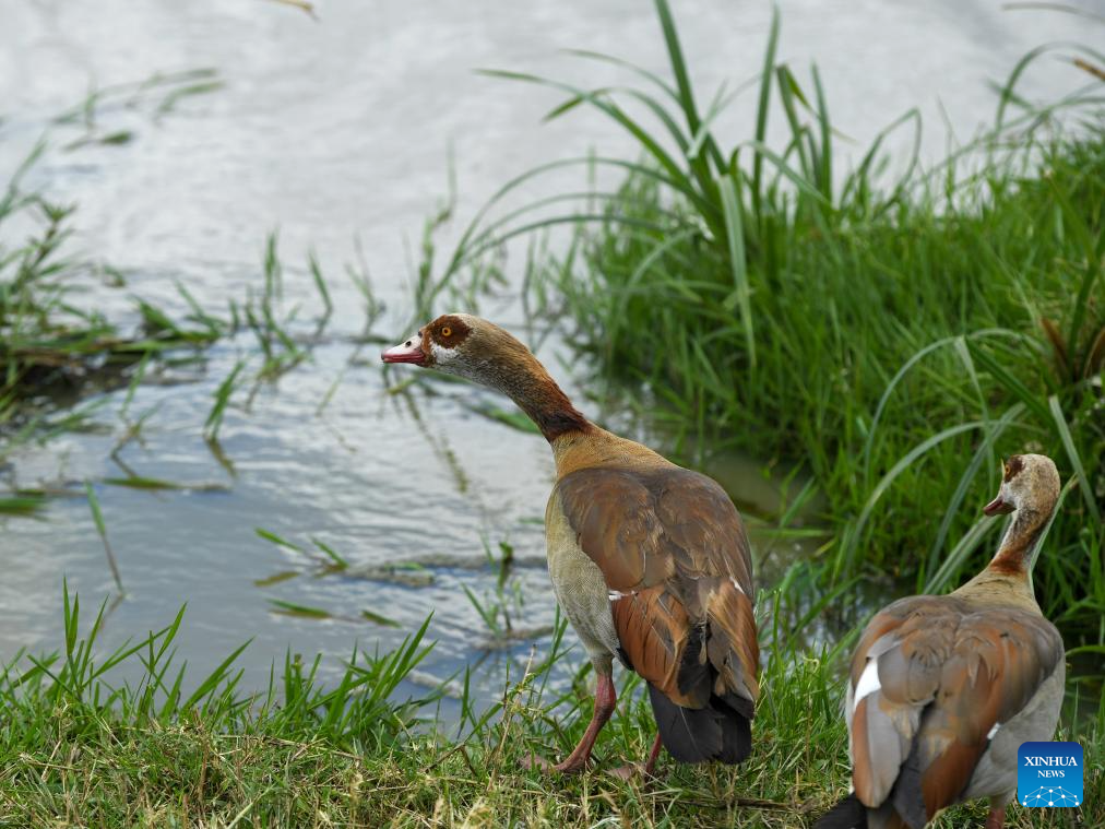 This photo taken on Oct. 15, 2023 shows Egyptian geese at Nairobi National Park in Nairobi, Kenya. The Nairobi National Park, situated approximately 7 kilometers from the city center, is a habitat for varied wildlife population. Established in 1946, this park is home to nearly 100 species of mammals and over 500 species of birds (Xinhua/Li Yahui)