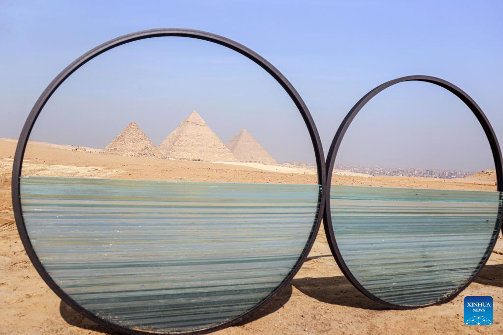 This photo taken on Oct. 26, 2023 shows an artwork exhibited during the "Forever Is Now" international art exhibition at Giza Pyramids scenic spot in Giza, Egypt. With the participation of 14 international artists, the exhibition "Forever Is Now" was launched on Thursday in the area of Egypt's Pyramids of Giza and the surrounding plateau. The exhibition runs from Oct. 26 to Nov. 18. (Xinhua/Ahmed Gomaa)