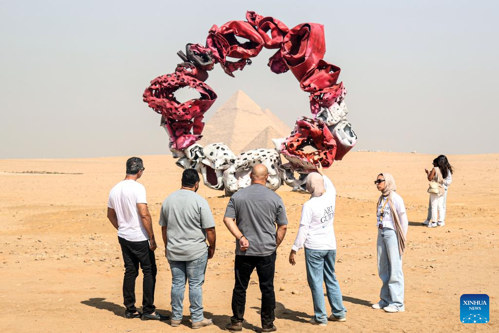 Visitors view an artwork exhibited during the "Forever Is Now" international art exhibition at Giza Pyramids scenic spot in Giza, Egypt, Oct. 26, 2023. With the participation of 14 international artists, the exhibition "Forever Is Now" was launched on Thursday in the area of Egypt's Pyramids of Giza and the surrounding plateau. The exhibition runs from Oct. 26 to Nov. 18. (Xinhua/Ahmed Gomaa)
