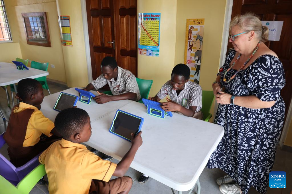 Students use tablets at a multimedia library built from recycled plastic bottles in Kokrobite, a fishing community on the outskirts of Accra, Ghana, on Oct. 31, 2023. A multimedia library, built from recycled plastic bottles by an African architect, was inaugurated late Tuesday in Kokrobite, providing schoolchildren from impoverished families with access to an array of learning resources. (Photo by Seth/Xinhua)