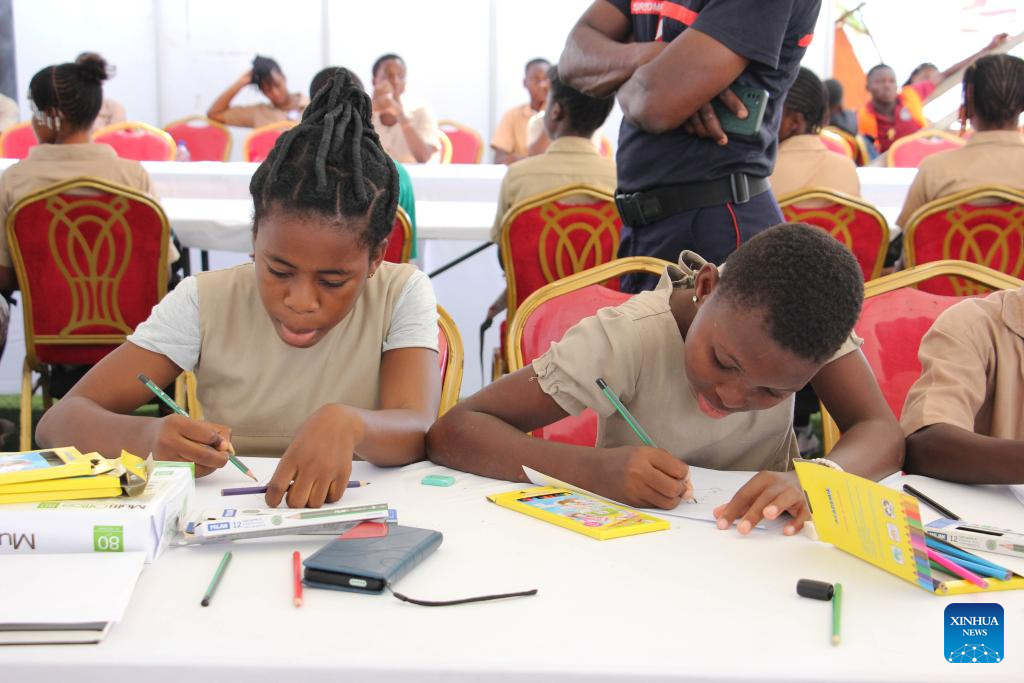 Primary school students learn how to draw at a drawing activity during the 2023 edition of the National Book Fair of Benin in Cotonou Congress Center, in Cotonou, Benin, Nov. 9, 2023. The 2023 edition of the National Book Fair of Benin began in the port city of Cotonou, the country's economic hub, Thursday and will run until Sunday. (Photo by Seraphin Zounyekpe/Xinhua)