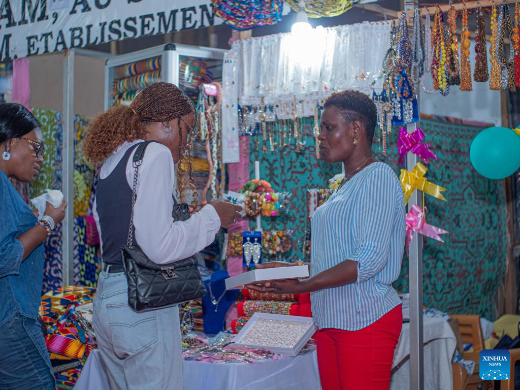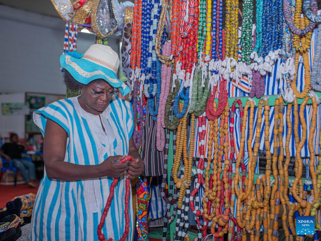 An exhibitor arranges exhibits at the 18th edition of the International Fair of Lome (FIL), in Lome, Togo, on Nov. 25, 2023. The 18th edition of FIL, one of West Africa's major trade events, opened on Thursday in Togo's capital with the participation of 1,148 exhibitors from 22 countries across Africa, Asia and Europe. (Photo by Yawovi Kpowoenou/Xinhua)