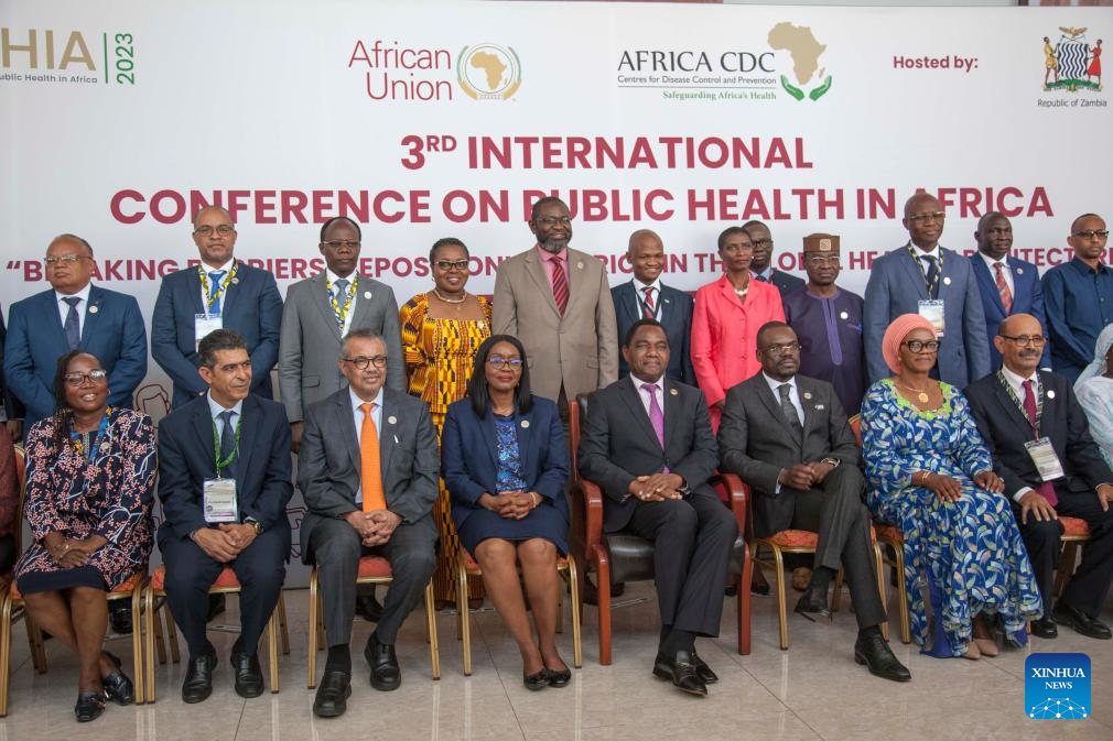 Leaders and delegates pose for a photo at the Third International Conference on Public Health in Africa in Lusaka, Zambia, on Nov. 27, 2023. The Third International Conference on Public Health in Africa (CPHIA) opened here Monday with a call for increased partnership and investment to improve healthcare delivery. (Xinhua/Martin Mbangweta)
