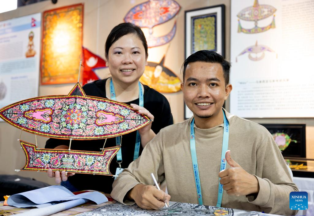 A Malaysian artist (R) and his cooperator display a kite during an intangible cultural heritage exhibition on the Maritime Silk Road in Quanzhou, southeast China's Fujian Province, Dec. 9, 2023. The city of Quanzhou is widely believed to be the starting point of the ancient Maritime Silk Road. (Xinhua/Wei Peiquan)