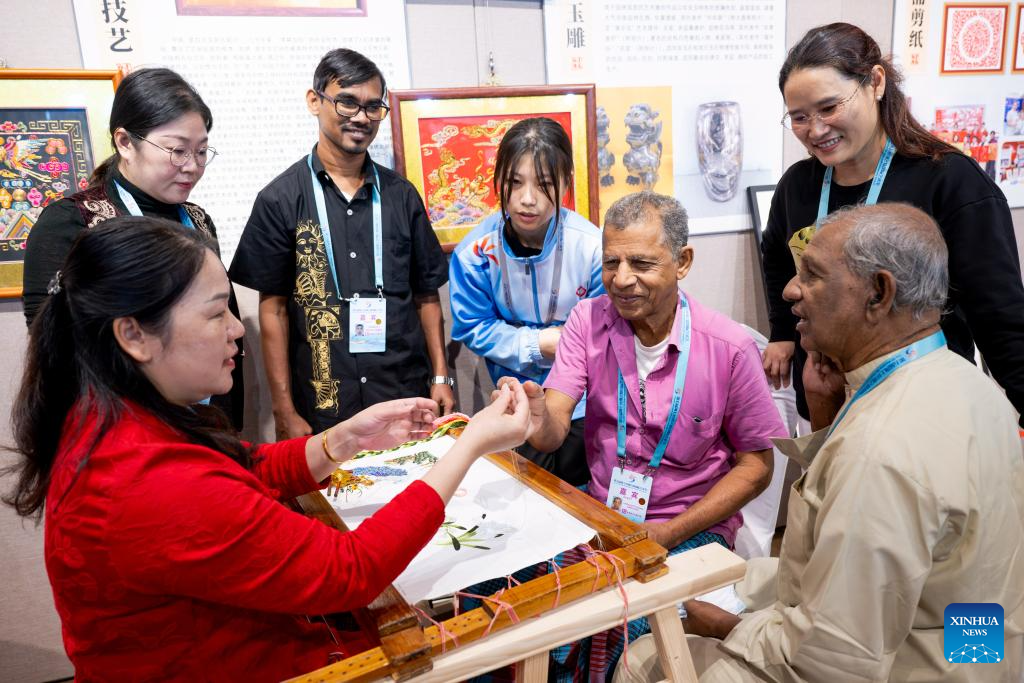 Sri lankan visitors learn about traditional techniques of Zhangzhou embroidery, which is recognized as a provincial intangible cultural heritage of Fujian, during an intangible cultural heritage exhibition on the Maritime Silk Road in Quanzhou, southeast China's Fujian Province, Dec. 9, 2023. The city of Quanzhou is widely believed to be the starting point of the ancient Maritime Silk Road. (Xinhua/Wei Peiquan)