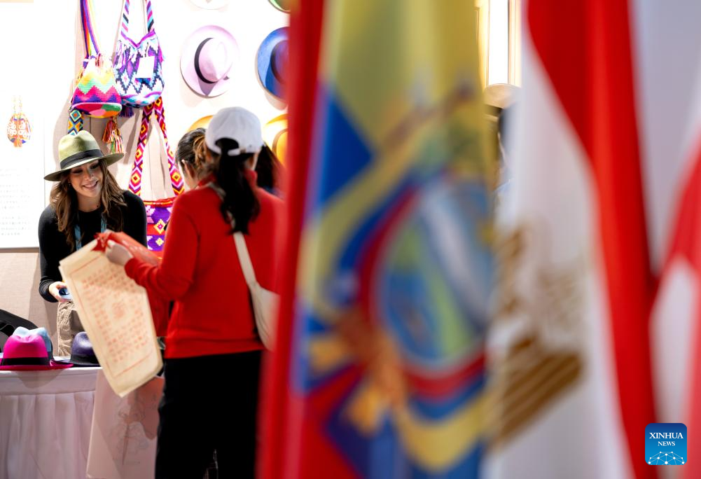 Visitors select products from Ecuador during an intangible cultural heritage exhibition on the Maritime Silk Road in Quanzhou, southeast China's Fujian Province, Dec. 9, 2023. The city of Quanzhou is widely believed to be the starting point of the ancient Maritime Silk Road. (Xinhua/Wei Peiquan)