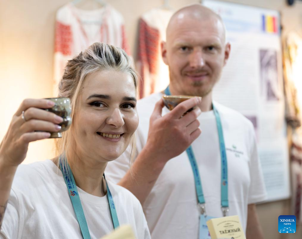 A Russian artist (L) and her cooperator display ceramic cups designed by them during an intangible cultural heritage exhibition on the Maritime Silk Road in Quanzhou, southeast China's Fujian Province, Dec. 9, 2023. The city of Quanzhou is widely believed to be the starting point of the ancient Maritime Silk Road. (Xinhua/Wei Peiquan)