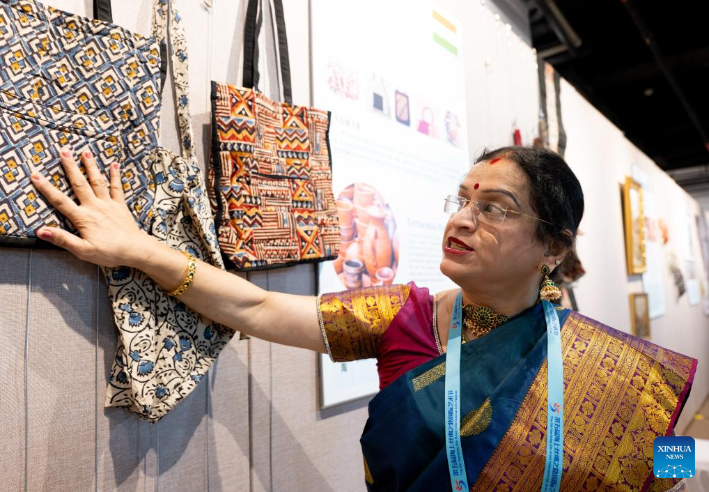 An Indian artist displays handmade bags during an intangible cultural heritage exhibition on the Maritime Silk Road in Quanzhou, southeast China's Fujian Province, Dec. 9, 2023. The city of Quanzhou is widely believed to be the starting point of the ancient Maritime Silk Road. (Xinhua/Wei Peiquan)