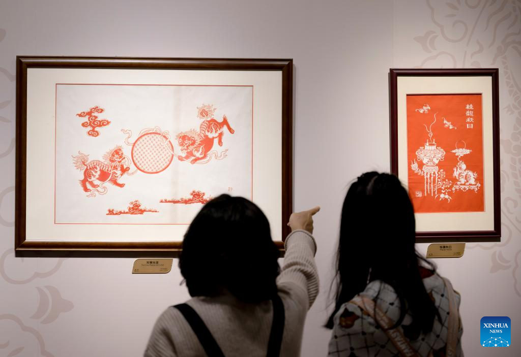 Visitors look at artwork during an intangible cultural heritage exhibition on the Maritime Silk Road in Quanzhou, southeast China's Fujian Province, Dec. 9, 2023. The city of Quanzhou is widely believed to be the starting point of the ancient Maritime Silk Road. (Xinhua/Wei Peiquan)