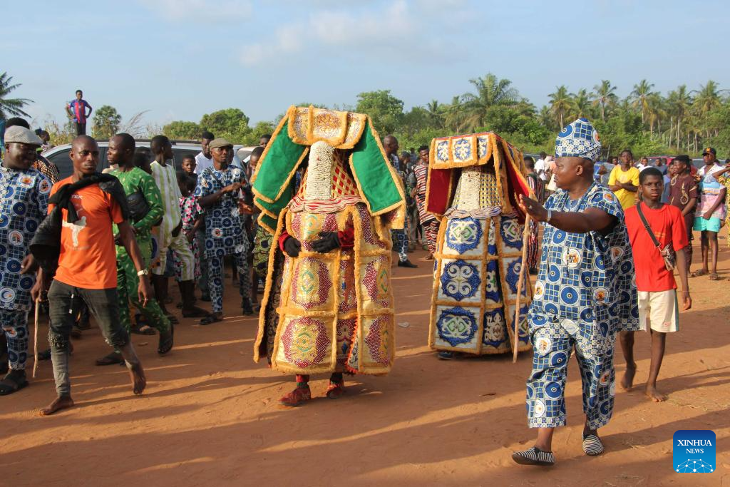 A local wearing costumes performs mask dance during an annual festival in Ouidah, Benin, Dec. 10, 2023. (Photo by Seraphin Zounyekpe/Xinhua)
