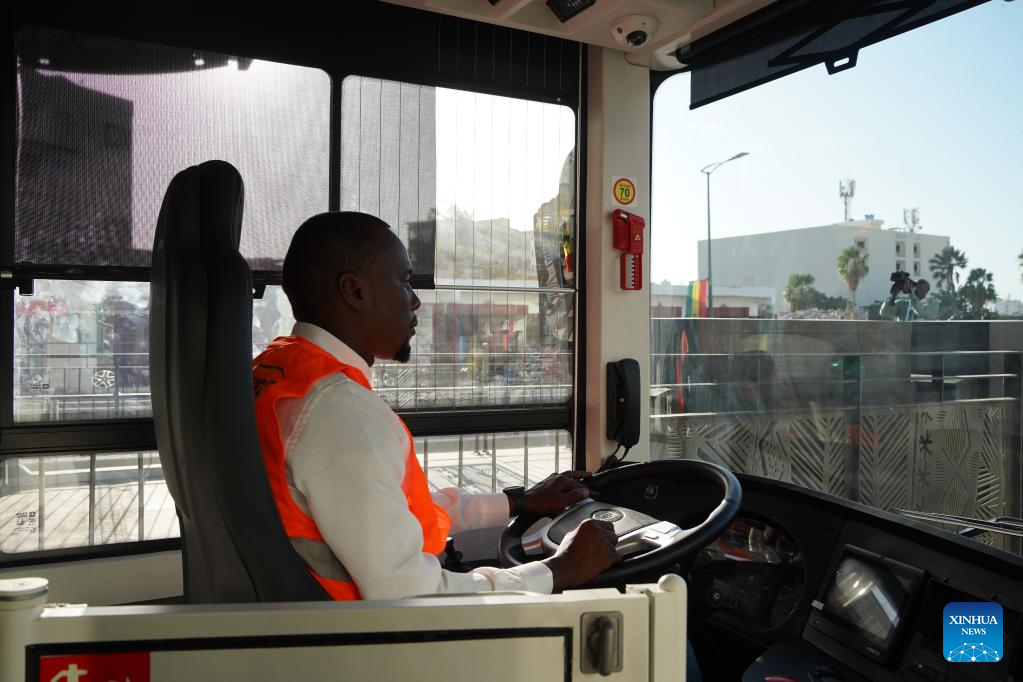 A driver prepares to set off a bus for the Dakar Bus Rapid Transit (BRT) project in Dakar, Senegal, Dec. 27, 2023. Senegal on Wednesday launched sub-Saharan Africa's first all-electric BRT network in the capital of Dakar.(Xinhua/Wang Zizheng)