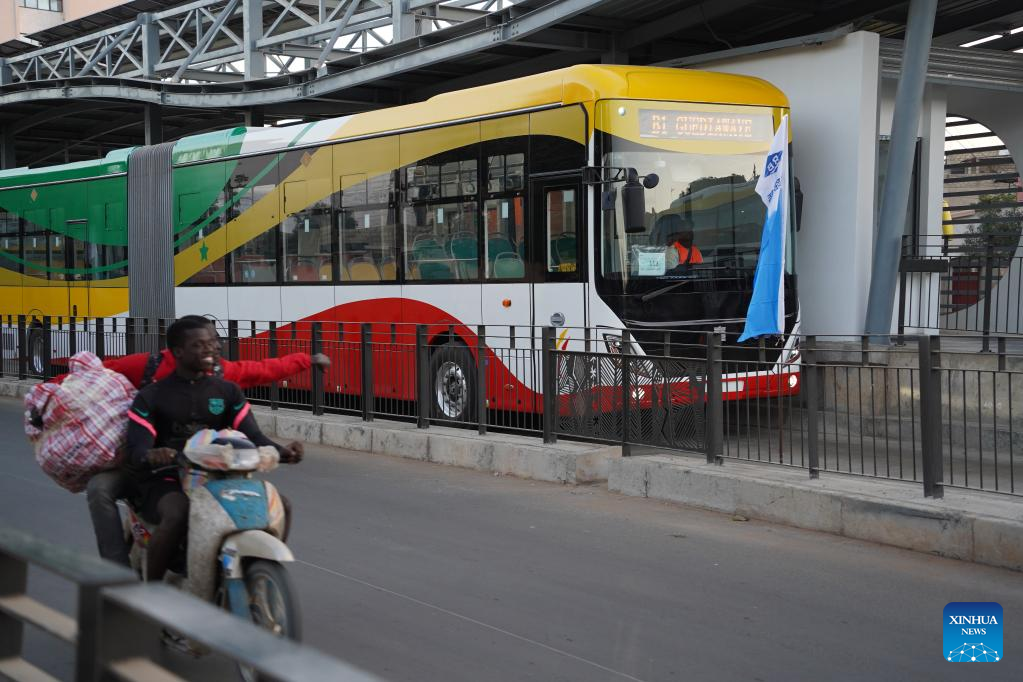 This photo taken on Dec. 27, 2023 shows a bus of the Dakar Bus Rapid Transit (BRT) project in Dakar, Senegal. Senegal on Wednesday launched sub-Saharan Africa's first all-electric BRT network in the capital of Dakar.(Xinhua/Wang Zizheng)