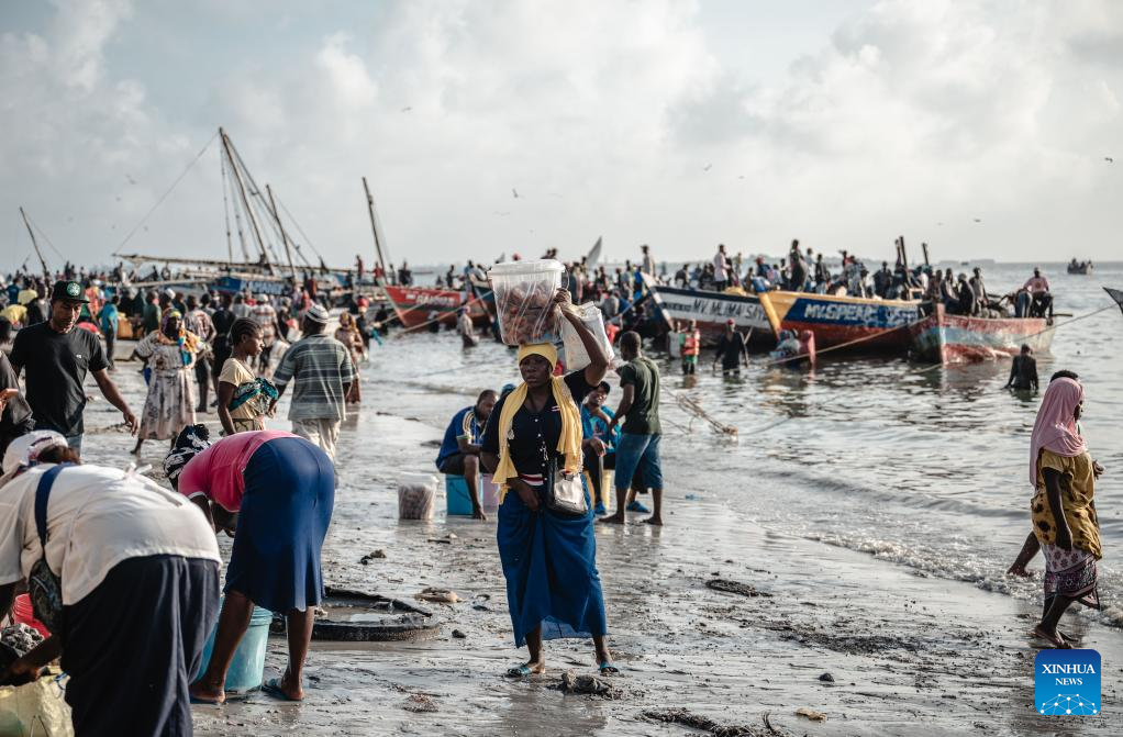 A woman sells snacks at a fishing port in Dar es Salaam, Tanzania on Dec. 28, 2023. (Xinhua/Wang Guansen)