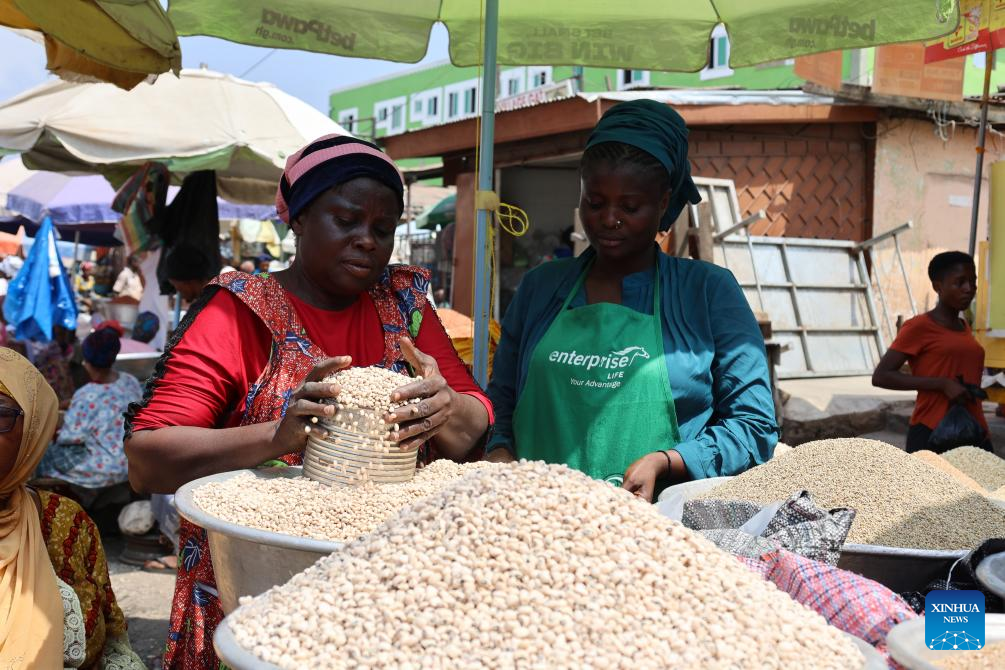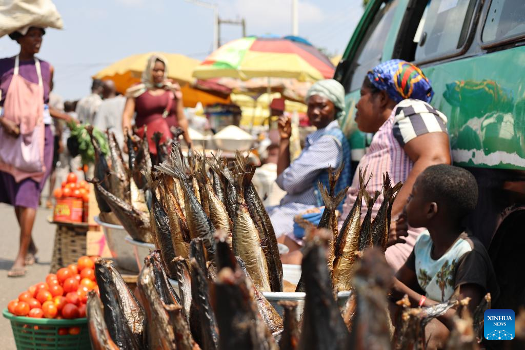 Vendors sell goods at a market in Accra, Ghana, Jan. 10, 2024. The Ghana Statistical Service announced on Wednesday that the country's inflation rate dropped to 23.2 percent in December last year, the fifth consecutive decrease since August 2023. (Photo by Seth/Xinhua)