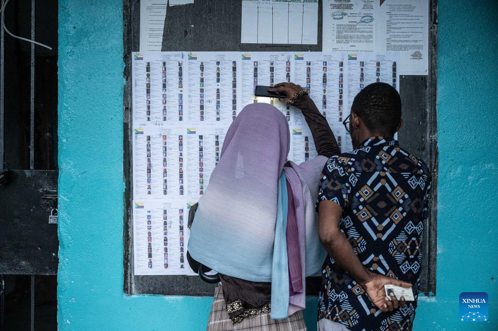 People check the information of candidates at a polling station in Mitsudje, Comoros, Jan. 14, 2024. Comoros kicked off its first round of the presidential election on Sunday to select the national leader from among six candidates, including incumbent President Azali Assoumani, for the next five years. (Xinhua/Wang Guansen)
