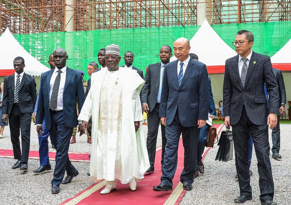 Chinese Vice Premier Liu Guozhong, also a member of the Political Bureau of the Communist Party of China Central Committee, visits the construction site of the Cameroonian National Assembly building with Cavaye Yeguie Djibril, president of Cameroon's National Assembly, in Yaounde, Cameroon, Jan. 18, 2024. Liu Guozhong, who led a Chinese government delegation, visited Cameroon on Wednesday and Thursday. (Photo by Kepseu/Xinhua)
