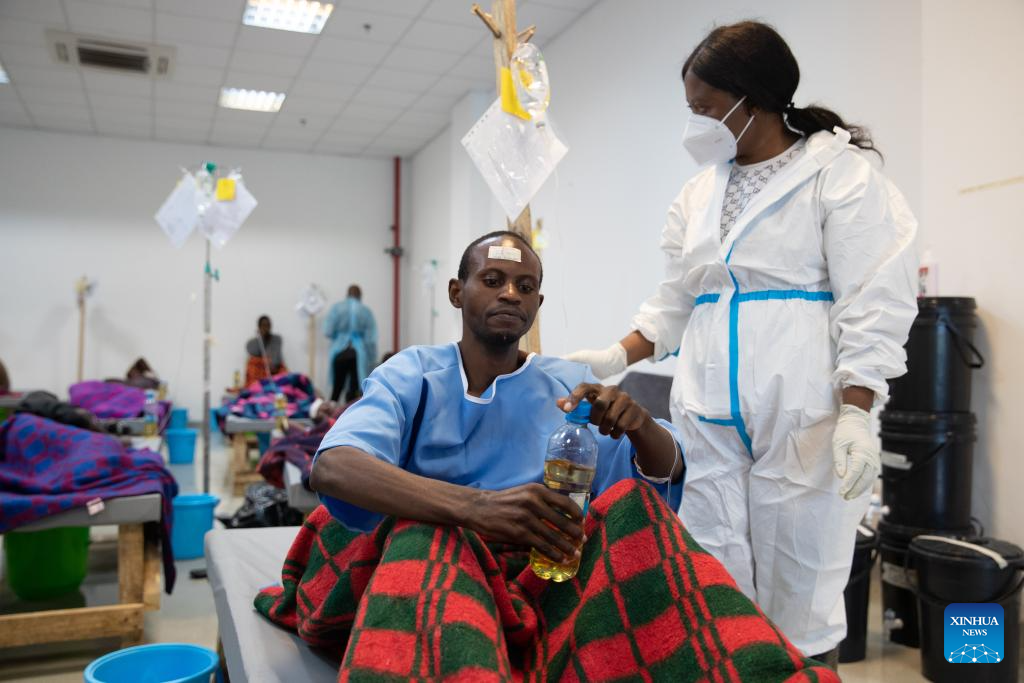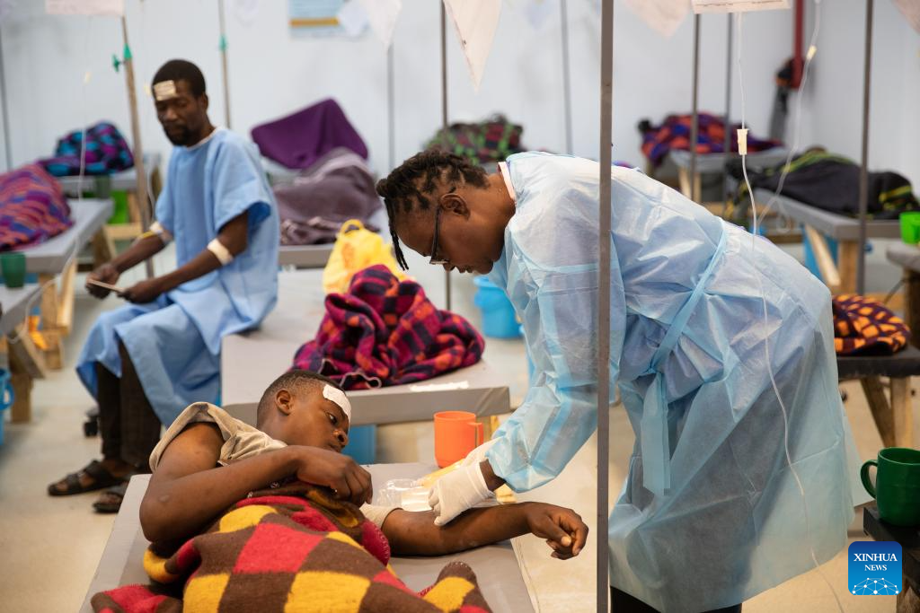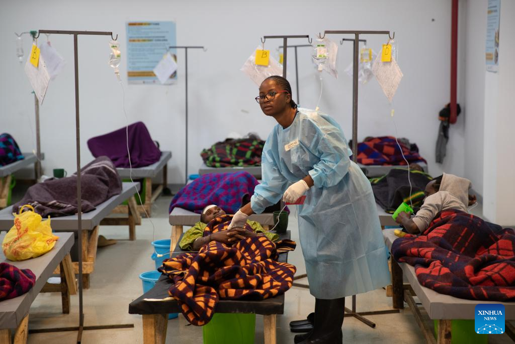 A medical worker takes care of a patient at the National Heroes Stadium, which has been designated as a cholera treatment center, in Lusaka, Zambia, Jan. 18, 2024.