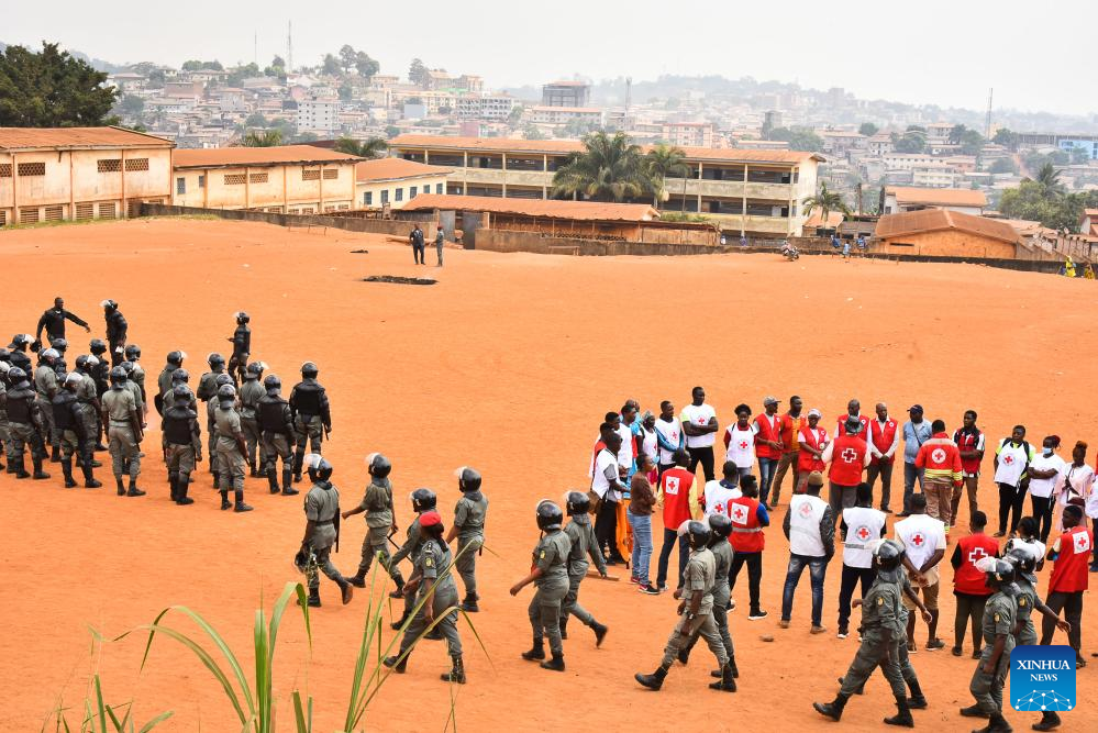 Gendarmes and medical workers are seen at the Etoug-Ebe Bilingual High School in Yaounde, Cameroon, on Jan. 22, 2024. About 106 students were injured on Monday following a stampede at the government-run secondary school in Yaounde, according to Minister of Public Health Manaouda Malachie. (Xinhua/Kepseu)