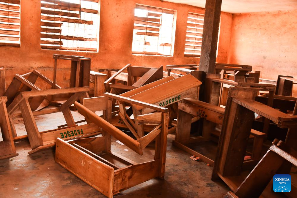 Photo taken on Jan. 22, 2024 shows overturned benches in a classroom after a stampede at the Etoug-Ebe Bilingual High School in Yaounde, Cameroon. About 106 students were injured on Monday following a stampede at the government-run secondary school in Yaounde, according to Minister of Public Health Manaouda Malachie. (Xinhua/Kepseu)