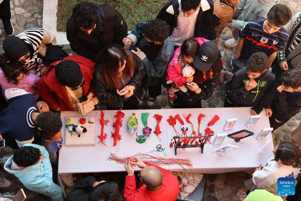 People look at traditional Chinese knotting demonstration during a cultural event marking the coming Chinese Spring Festival in Rabat, Morocco, on Jan. 27, 2024. The cultural event kicked off here on Jan. 22 and concluded on Jan. 27 to celebrate the upcoming Chinese Lunar New Year of the Dragon. (Xinhua/Huo Jing)