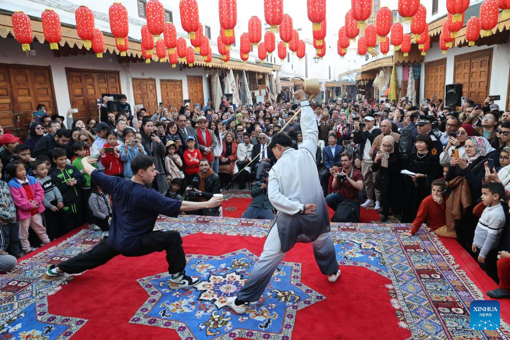 People watch a tea art performance during a cultural event marking the coming Chinese Spring Festival in Rabat, Morocco, on Jan. 27, 2024. The cultural event kicked off here on Jan. 22 and concluded on Jan. 27 to celebrate the upcoming Chinese Lunar New Year of the Dragon. (Xinhua/Huo Jing)