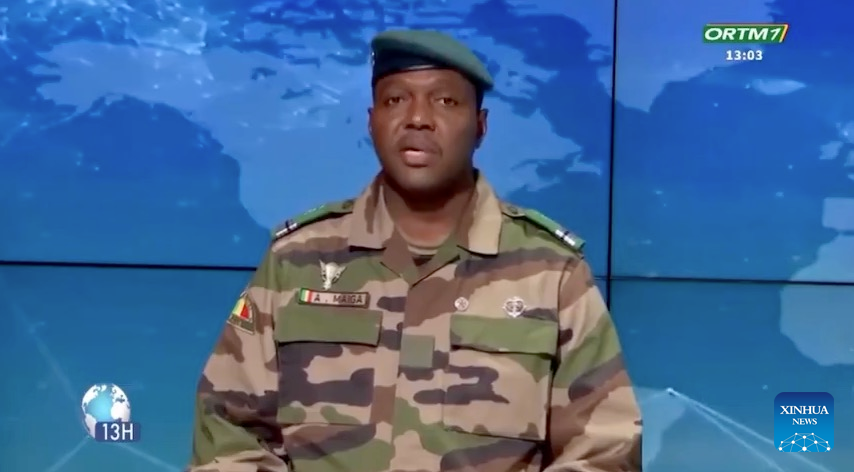 A screenshot taken from a video shows Colonel Abdoulaye Maiga, Malian minister of Territorial Administration and Decentralization, and spokesperson for the transitional government of Mali, reading a joint statement in the television news of Malian television (ORTM), Jan. 28, 2024. Mali, Burkina Faso and Niger are no longer members of the Economic Community of West African States (ECOWAS), military officials of the three countries decided in a joint statement read this Sunday in the television news of Malian television (ORTM). (Xinhua)