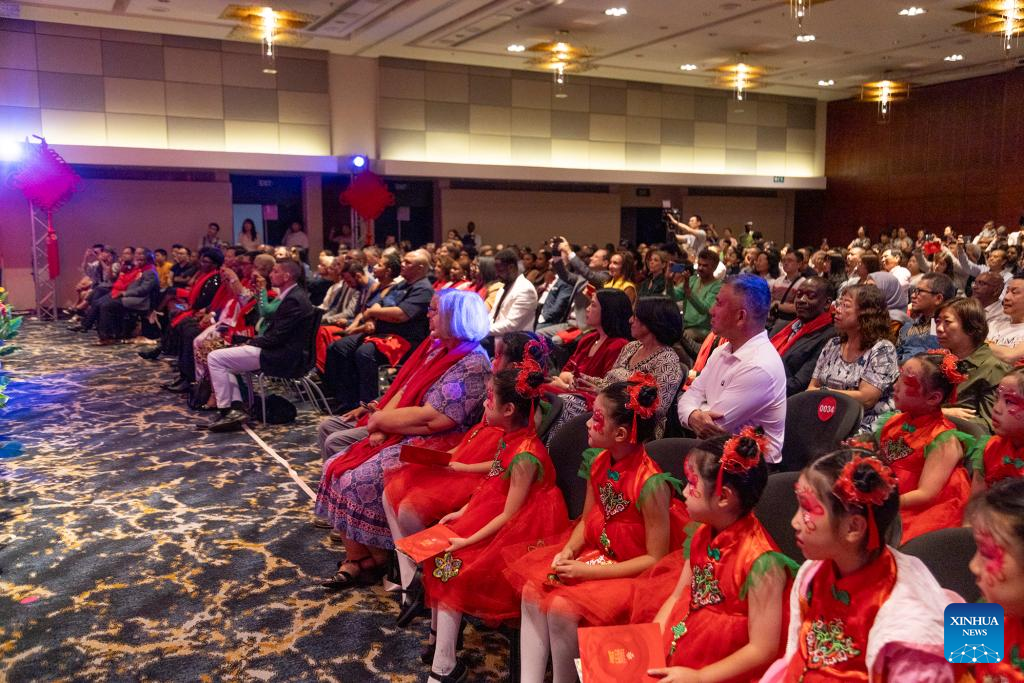 People watch a gala performance to celebrate the Spring Festival in Cape Town, South Africa, Jan. 27, 2024. A captivating gala performance presented by a Chinese arts troupe wowed the audience on Saturday evening in Cape Town, the legislative capital of South Africa. (Photo by Fred Barker/Xinhua)