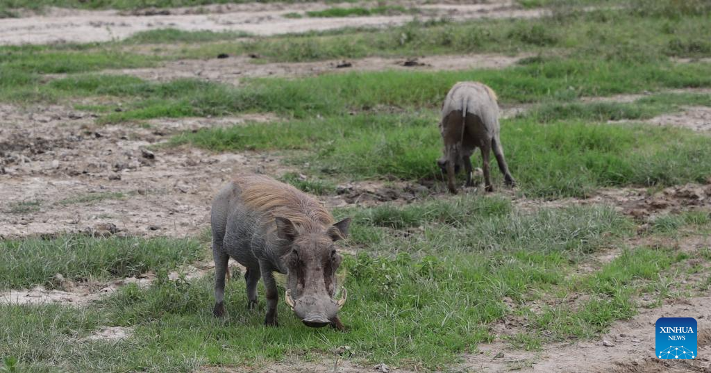 This photo taken on Jan. 29, 2024 shows a warthog (L) in Ngorongoro Conservation Area, Arusha, Tanzania. (Xinhua/Hua Hongli)