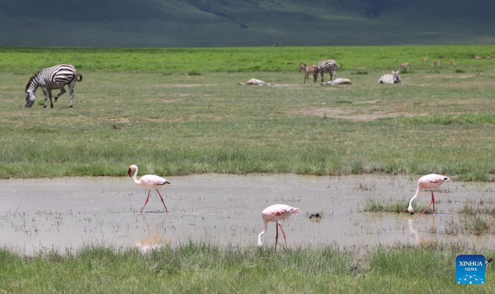 This photo taken on Jan. 29, 2024 shows flamingos (front) in Ngorongoro Conservation Area, Arusha, Tanzania. (Xinhua/Hua Hongli)