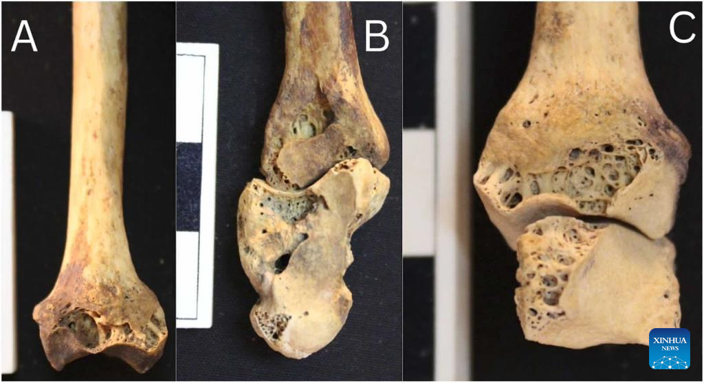 An image shows skeletal remains of an ancient Egyptian woman uncovered in Aswan, southern Egypt. An Italian-Polish archeological mission discovered skeletal remains of an ancient Egyptian woman who suffered rheumatoid arthritis at a cemetery in Aswan, the Egyptian Ministry of Tourism and Antiquities announced on Jan. 31, 2024. (Egyptian Ministry of Tourism and Antiquities/Handout via Xinhua)