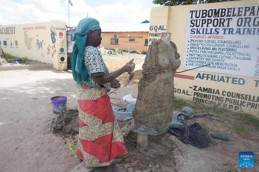 Artist Elizabeth Banda works on a life-size figure in Kapiri Mposhi, central Zambia, Jan. 26, 2024. (Photo by Lillian Banda/Xinhua)