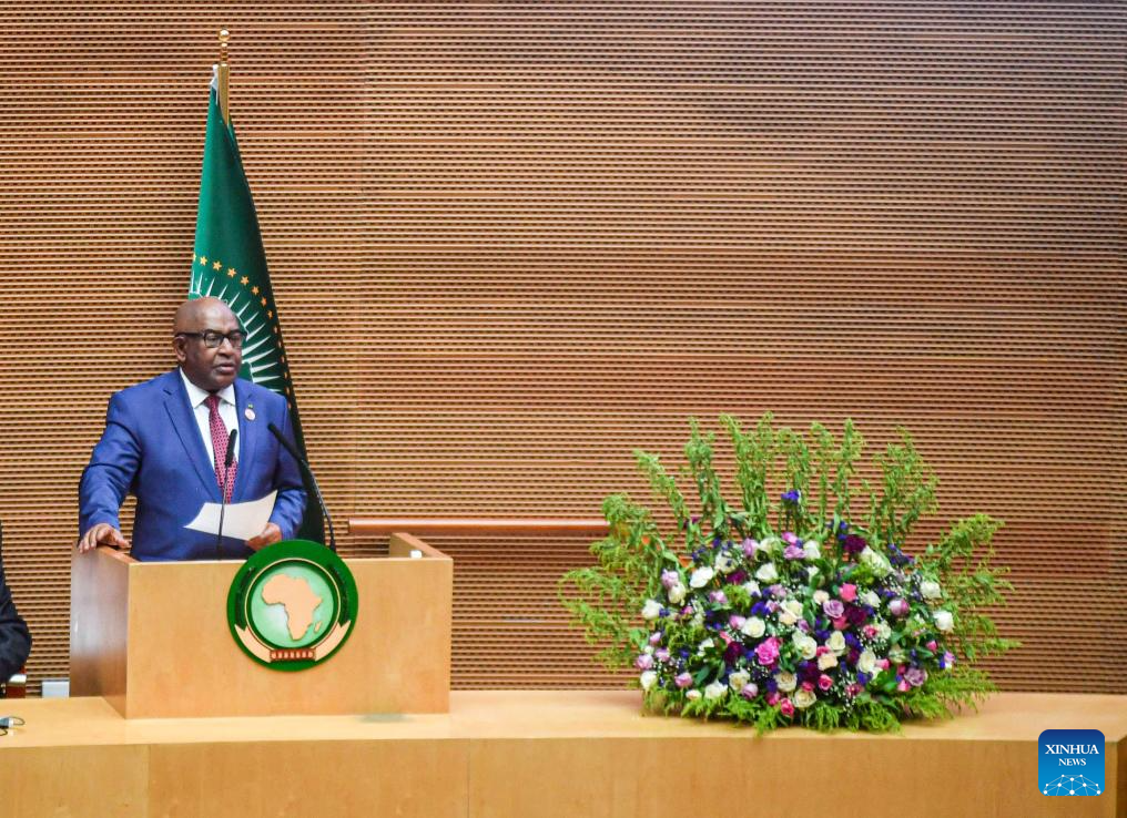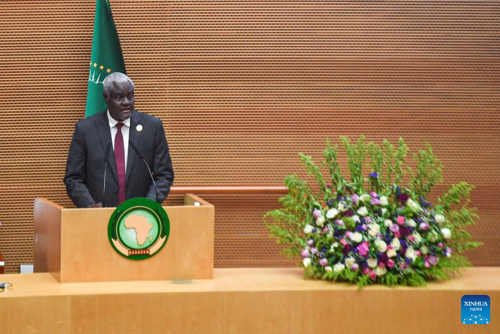 Chairperson of the African Union (AU) Commission Moussa Faki Mahamat delivers a speech during the 37th Ordinary Session of the AU Assembly of the Heads of State and Government in Addis Ababa, Ethiopia, Feb. 17, 2024. The 37th Ordinary Session of the AU Assembly of the Heads of State and Government opened on Saturday at the AU headquarters in Addis Ababa, the capital of Ethiopia. (Xinhua/Michael Tewelde)
