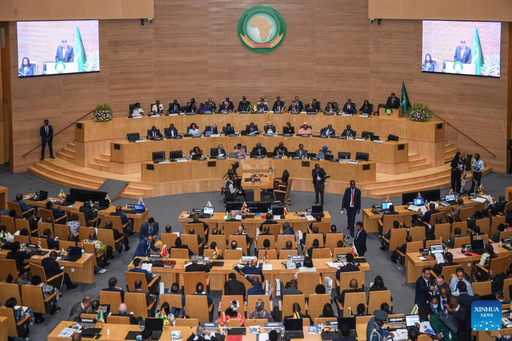 This photo taken on Feb. 17, 2024 shows a view of the 37th Ordinary Session of the African Union (AU) Assembly of the Heads of State and Government in Addis Ababa, Ethiopia. The 37th Ordinary Session of the AU Assembly of the Heads of State and Government opened on Saturday at the AU headquarters in Addis Ababa, the capital of Ethiopia. (Xinhua/Li Yahui)