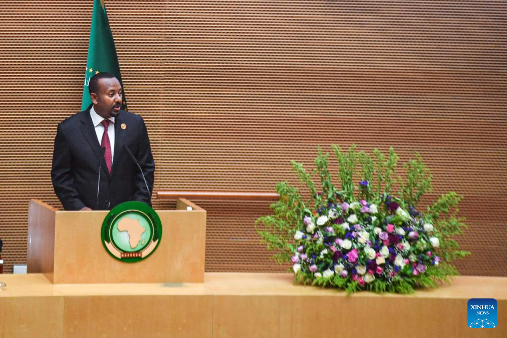Ethiopian Prime Minister Abiy Ahmed delivers a speech during the 37th Ordinary Session of the African Union (AU) Assembly of the Heads of State and Government, held in Addis Ababa, Ethiopia, Feb. 17, 2024. The 37th Ordinary Session of the AU Assembly of the Heads of State and Government opened here on Saturday. (Photo by Michael Tewelde/Xinhua)