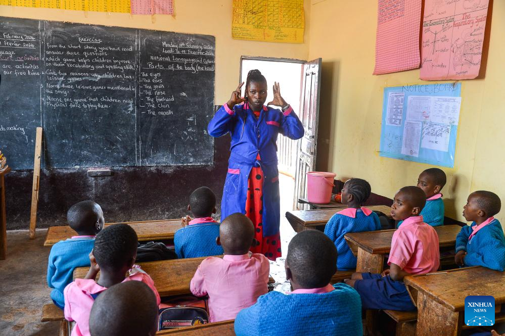 A teacher teaches students to pronounce in local language during a class at Progressive English Nursery and Primary School in Bafoussam, Cameroon, Feb. 19, 2024. (Photo by Kepseu/Xinhua)