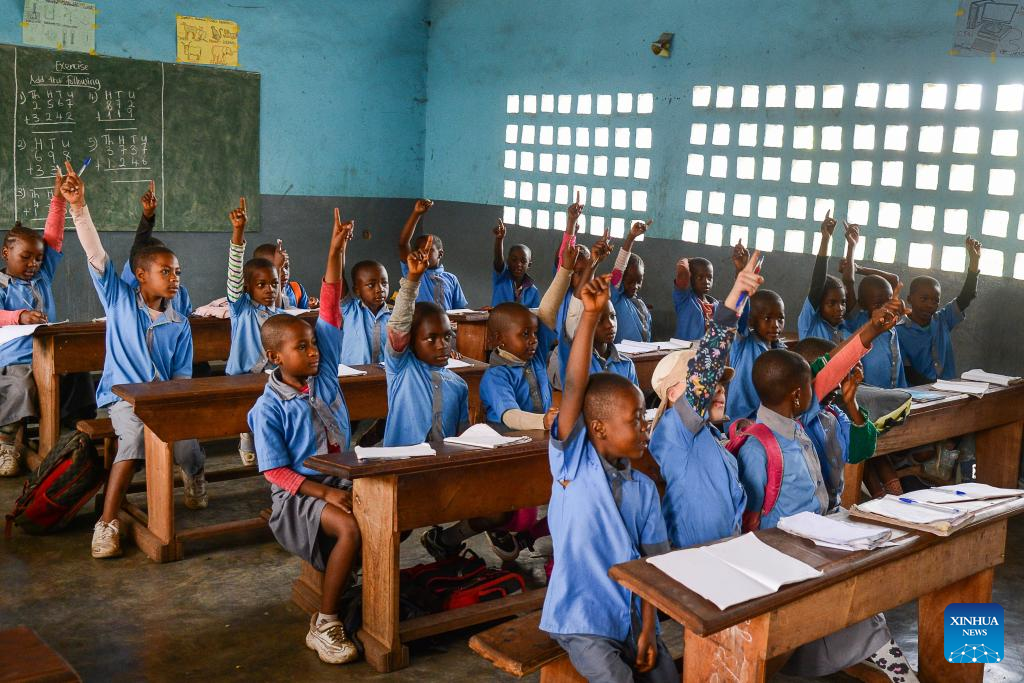 Students raise hands to answer questions during a class at Les Normaliens Lay Private Bilingual School in Foumbot, Cameroon, Feb. 19, 2024. (Photo by Kepseu/Xinhua)