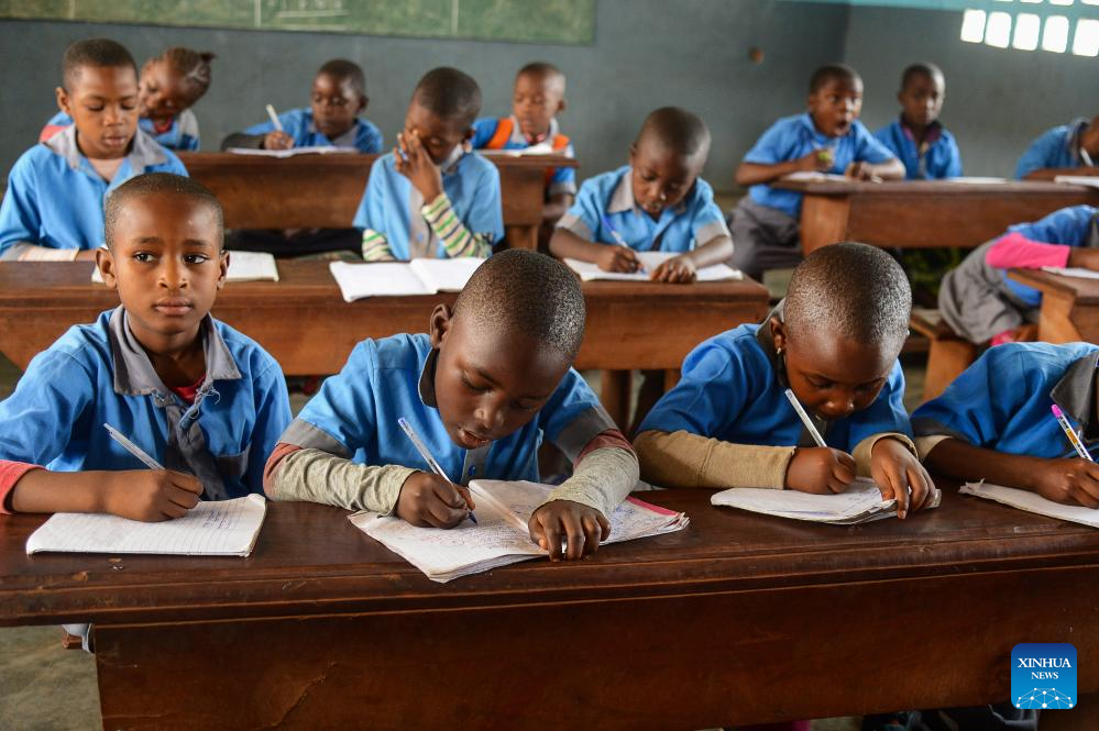 Students take notes during a class at Les Normaliens Lay Private Bilingual School in Foumbot, Cameroon, Feb. 19, 2024. (Photo by Kepseu/Xinhua)