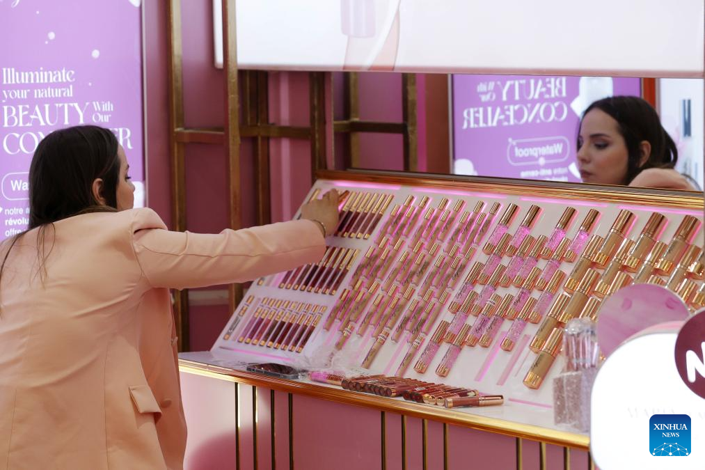 An exhibitor arranges cosmetics during Cosmetica Algeria, an international beauty trade show in Algiers, Algeria on Feb. 21, 2024. Dedicated to sectors of beauty industry, the trade show kicked off on Wednesday and will last till Feb. 24. (Xinhua)