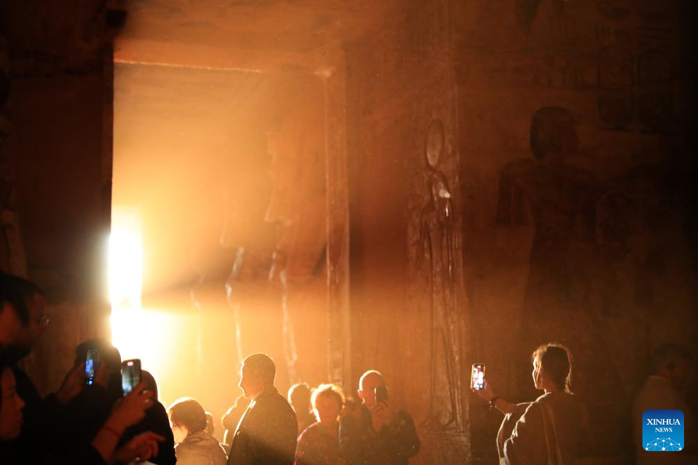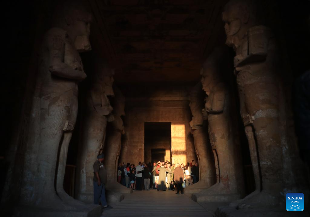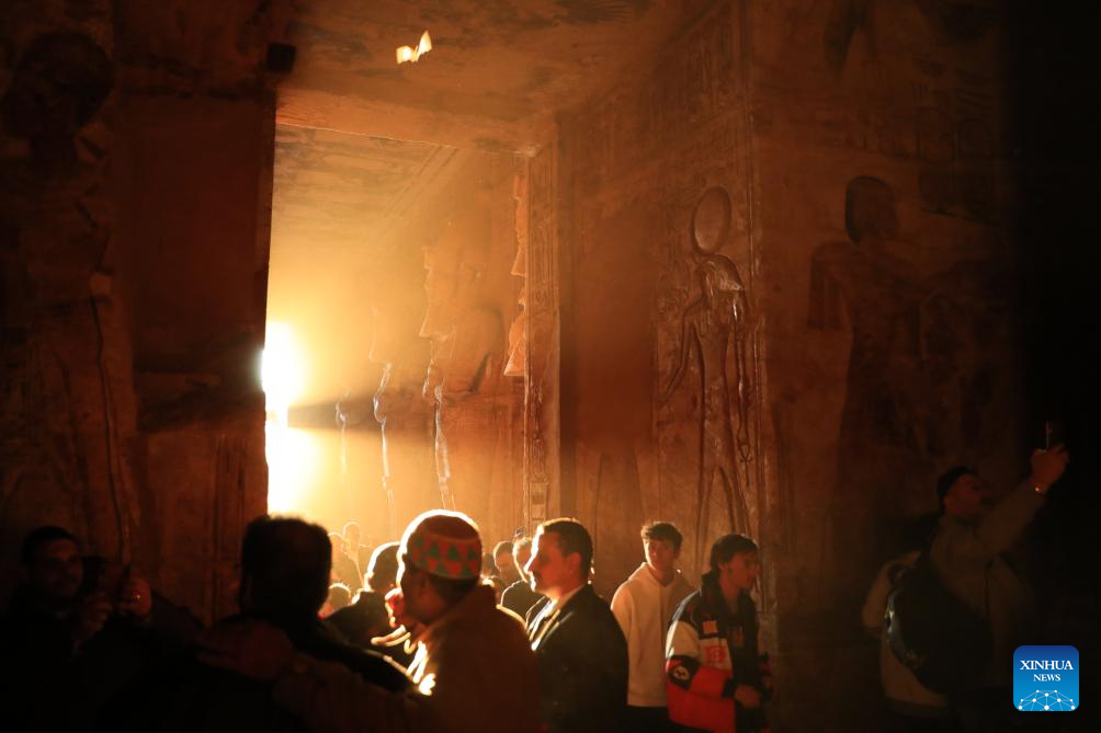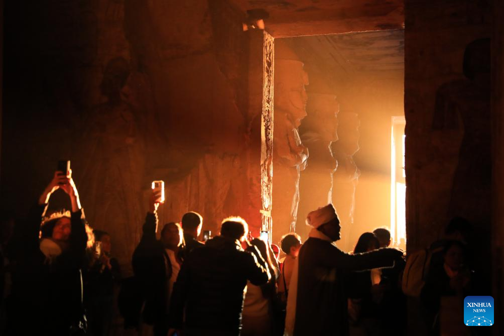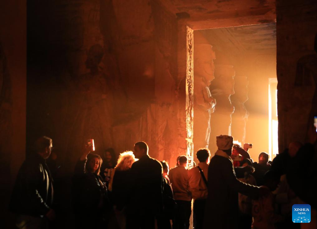 Tourists take photos of sculptures illuminated by rays of morning sun at the Great Temple of Abu Simbel during the Sun Festival in Aswan, Egypt, Feb. 22, 2024. During the Sun Festival, which falls on Feb. 22 and Oct. 22 every year, rays of the morning sun would reach the innermost shrine of the Great Temple of Abu Simbel and illuminate the inside sculptures. (Xinhua/Sui Xiankai)