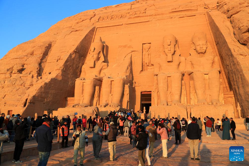 Tourists visit the Great Temple of Abu Simbel during the Sun Festival in Aswan, Egypt, Feb. 22, 2024. During the Sun Festival, which falls on Feb. 22 and Oct. 22 every year, rays of the morning sun would reach the innermost shrine of the Great Temple of Abu Simbel and illuminate the inside sculptures. (Xinhua/Sui Xiankai)