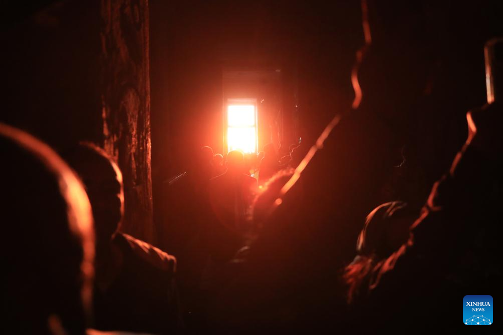 This photo taken on Feb. 22, 2024 shows rays of morning sun reaching into the Great Temple of Abu Simbel during the Sun Festival in Aswan, Egypt. During the Sun Festival, which falls on Feb. 22 and Oct. 22 every year, rays of the morning sun would reach the innermost shrine of the Great Temple of Abu Simbel and illuminate the inside sculptures. (Xinhua/Sui Xiankai)