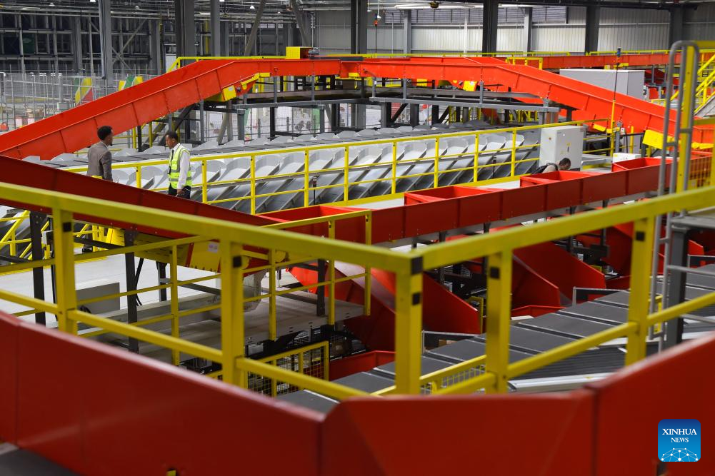 Photo taken on Feb. 29, 2024 shows the sorting machine at the e-commerce logistics hub in Addis Ababa, Ethiopia. The Ethiopian Airlines has inaugurated a new e-commerce logistics hub in Addis Ababa, the capital of Ethiopia, to meet the surging demands of online shoppers and retailers. Built by China National Aero-Technology International Engineering Cooperation, the e-commerce logistics hub covers about 15,000 square meters and has a capacity to handle 150,000 tonnes of goods annually. (Xinhua/Michael Tewelde)