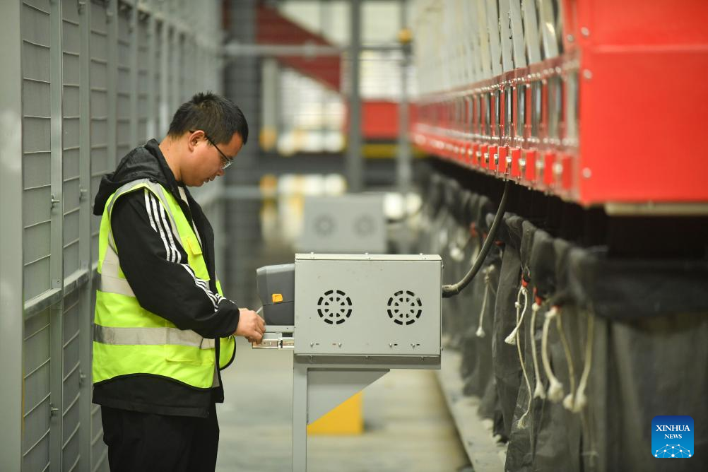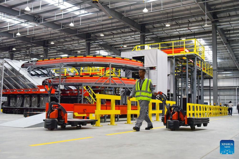 A worker operates the sorting machine at the e-commerce logistics hub in Addis Ababa, Ethiopia, on Feb. 29, 2024. The Ethiopian Airlines has inaugurated a new e-commerce logistics hub in Addis Ababa, the capital of Ethiopia, to meet the surging demands of online shoppers and retailers. Built by China National Aero-Technology International Engineering Cooperation, the e-commerce logistics hub covers about 15,000 square meters and has a capacity to handle 150,000 tonnes of goods annually. (Xinhua/Michael Tewelde)